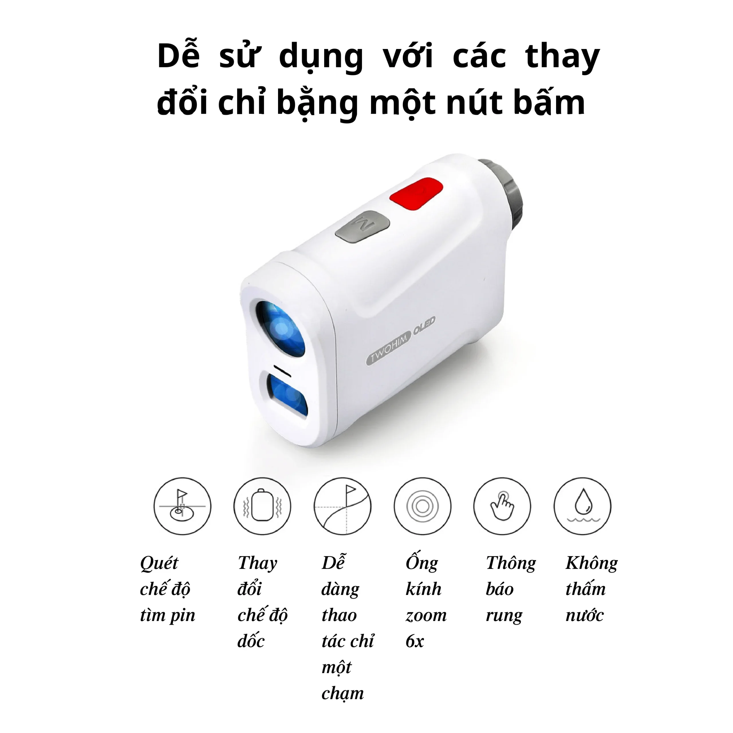 - Thiết kế nhỏ gọn và tiện lợi: Với kích thước nhỏ gọn, máy đo khoảng cách golf Twohim Mini OLED TB-07 dễ dàng mang theo trong túi gậy mà không gây cản trở trong quá trình chơi golf. Được thiết kế dễ sử dụng, bạn có thể nhanh chóng đo khoảng cách mà không cần phải dừng lại quá nhiều.
