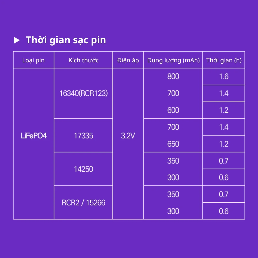 • Thiết kế tương thích hoàn hảo sạc được nhiều loại pin khác nhau: RCR2, RCR123, 17335, 14250, 15266