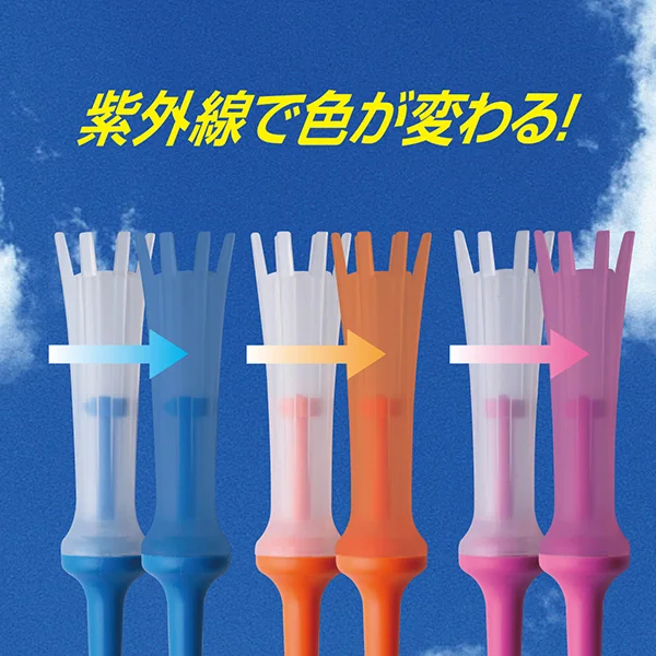 Đổi màu dưới tia UV: Khi tiếp xúc với tia UV, phần đầu tee sẽ chuyển từ trong suốt sang có màu. Và khi tia UV bị chặn, tee sẽ trở lại trạng thái trong suốt ban đầu.
